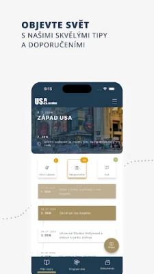 Průvodce zájezdem pro zákazníky USA na míru. Aplikace Vám poskytne denní program, kompletní plán celé cesty a všechny důležité dokumenty na jednom místě. Mějte snadný přístup k letenkám, rezervacím a dalším souborům. Poslouchejte audio nahrávky, které vás provedou Vaší cestou. S naší aplikací budete mít vše, co potřebujete, abyste si svou cestu užili bez stresu a naplno.