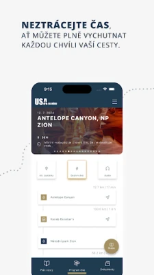Průvodce zájezdem pro zákazníky USA na míru. Aplikace Vám poskytne denní program, kompletní plán celé cesty a všechny důležité dokumenty na jednom místě. Mějte snadný přístup k letenkám, rezervacím a dalším souborům. Poslouchejte audio nahrávky, které vás provedou Vaší cestou. S naší aplikací budete mít vše, co potřebujete, abyste si svou cestu užili bez stresu a naplno.